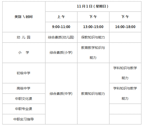 二、2015年下半年中小学教师资格考试笔试时间安排表