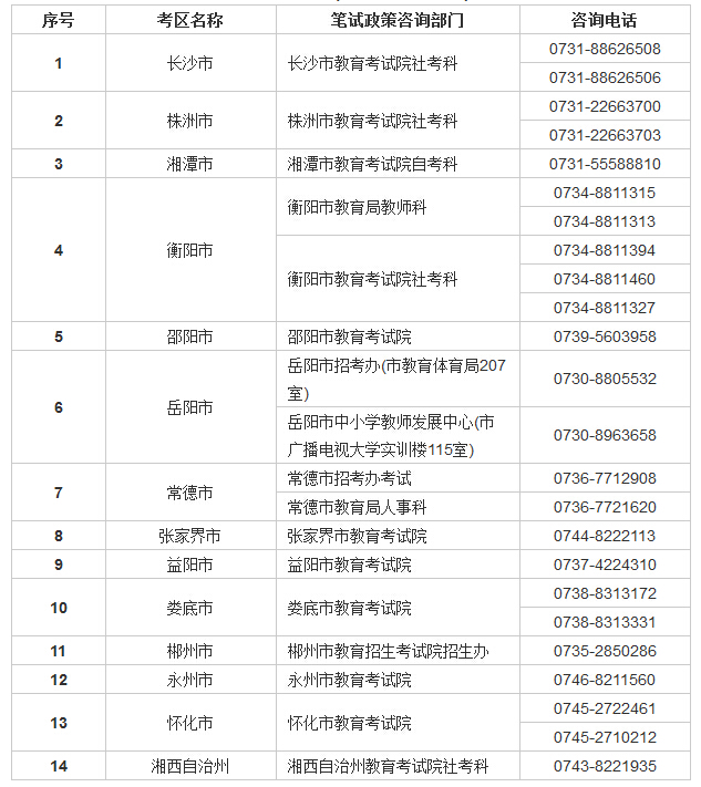 3.湖南省中小学教师资格考试笔试各考区(市州教育考试机构)联系地址和电话如下表: