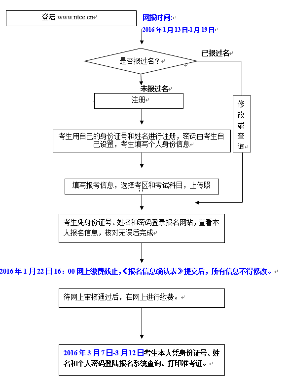 考生在2016年1月13日--1月19日登录中小学教师资格考试网(www.ntce.cn)。