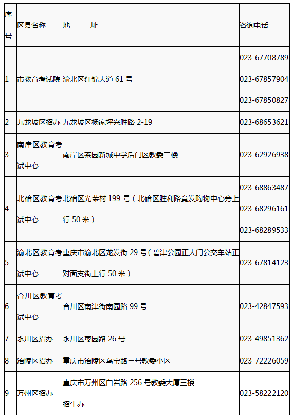 2.重庆市中小学教师资格考试笔试咨询电话一览表