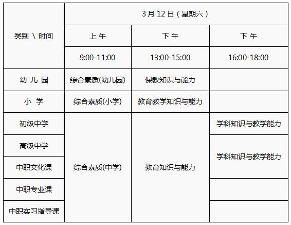 2016年上半年NTCE笔试日期为3月12日,各科目考试时间为120分钟,具体日程安排如下表: