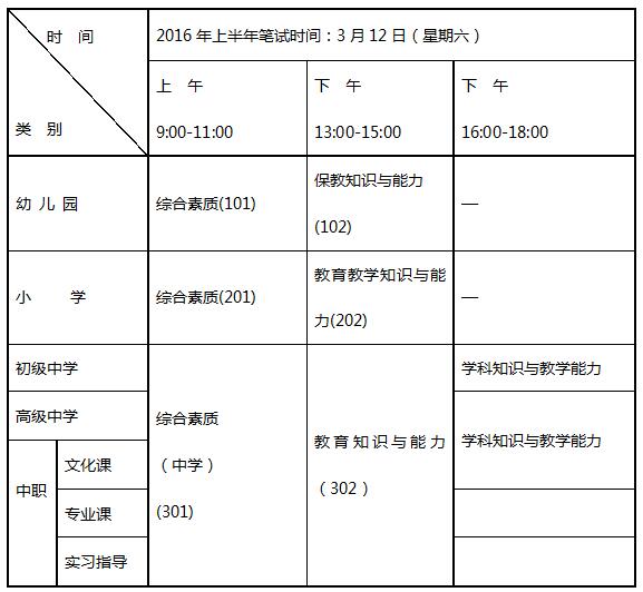 2016年上半年笔试考试时间为3月12日,笔试各科考试时间均为120分钟。各科目均采取纸笔方式考试。