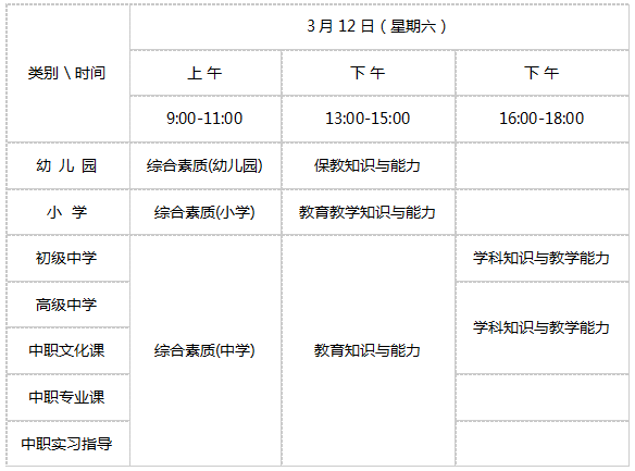 申请中职专业课及中职实习指导教师资格的人员参加中学教师的“综合素质”和“教育知识与能力”两科笔试,“学科知识与教学能力”科目纳入面试环节考查。