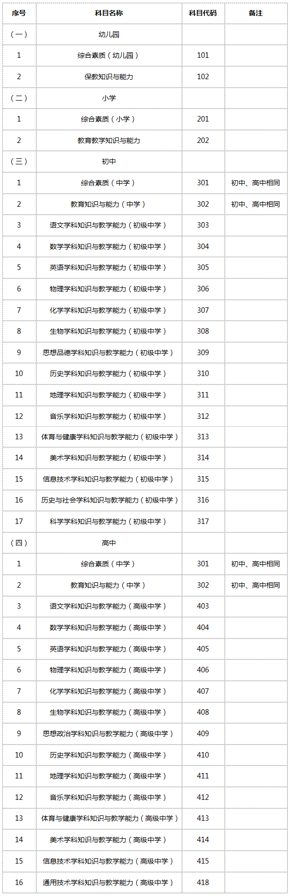 中小学教师资格考试(笔试)科目代码列表