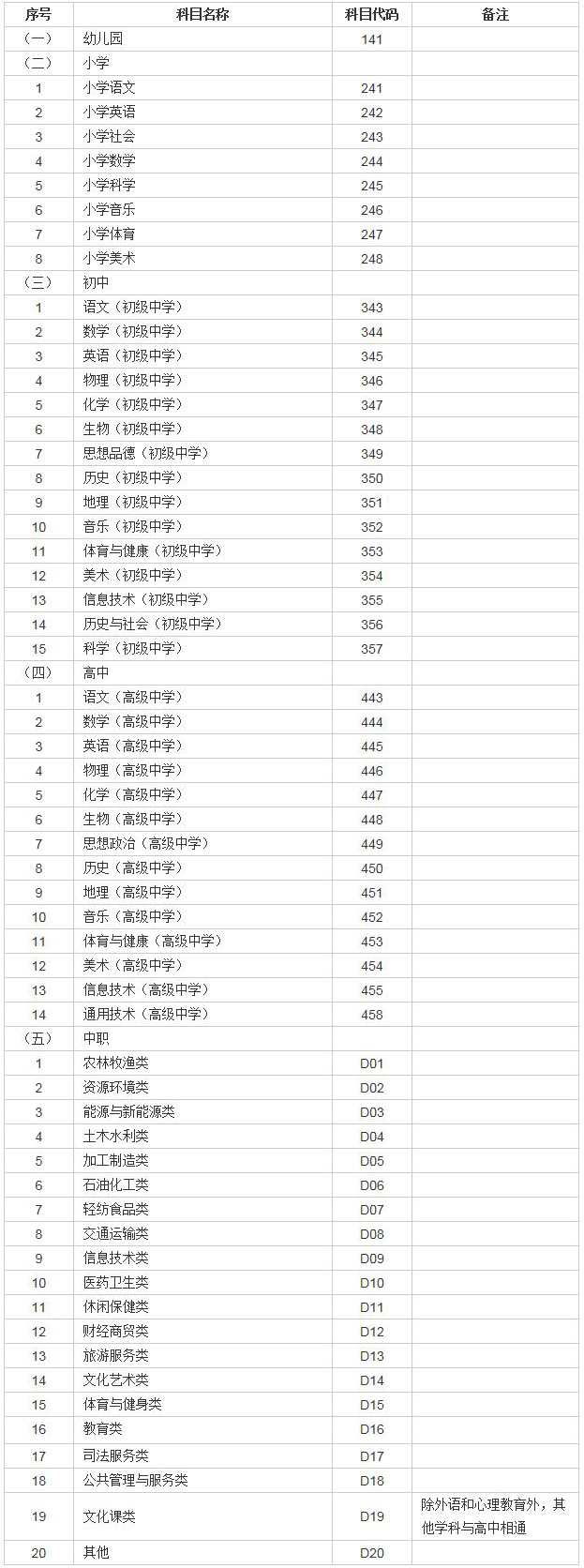 目前,NTCE开考五个学段,即幼儿园、小学、初中、高中和中职(含文化课、专业课、实习指导课3类)。各学段学科分类如下表:
